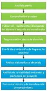 La primera fase del proyecto tuvo lugar en las instalaciones de Autogruas Sant Jordidel, CAT que lidera el proyecto. Consiste en un análisis previo en el que se estudian las piezas de aluminio que contienen los vehículos basándose en la información que los fabricantes proporcionan de cada marca y modelo, y la experiencia del CAT en la detección de piezas no férricas del VFU. A continuación, se llevó a cabo la comprobación y testeo mediante los cuales se identificaron la presencia real de piezas de aluminio y se procedió a su extracción de los vehículos para su clasificación en función a sus características.